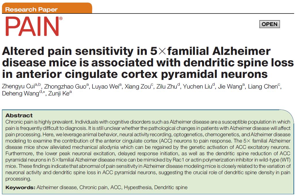 近日,疼痛学领域的专业顶级期刊《PAIN》以封面Research Paper形式发表了拉斯维加斯app中西医结合研究院柯尊记教授与基础医拉斯维加斯app 王德恒副研究员团队的最新研究成果“Altered pain sensitivity in 5×familial Alzheimer disease mice is associated with the dendritic spine loss in anterior cingulate cortex pyramidal neurons”。论文揭示了阿尔茨海默病(AD)病人痛敏改变的神经机制。AD的病理改变会导致前扣带回脑区(ACC)内的神经元结构发生变化,并引发炎症性痛敏反应的改变。