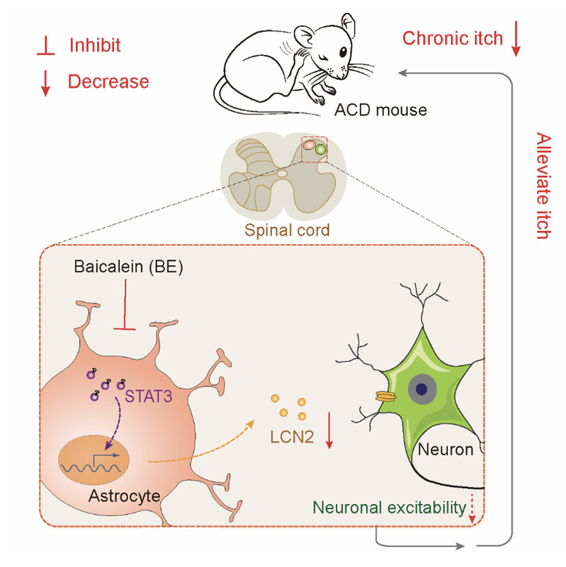 慢性痒是一种临床上常见的症状,持续而顽固的慢性痒严重影响了患者的生活质量。其病因复杂多样,皮肤病、系统性疾病及某些恶性肿瘤等都会出现严重的慢性痒。这一症状不仅限于皮肤表面,还可能伴随焦虑、抑郁等精神问题。但遗憾的是,目前临床上用于慢性痒的治疗药物或手段仍旧非常有限。黄芩素是黄芩的主要黄酮类活性成分之一,大量研究表明黄芩素具有多种药理作用,如抗氧化、抗炎和神经保护作用等。有研究报道黄芩素可缓解急性痒,但其对慢性痒的治疗作用仍未可知。