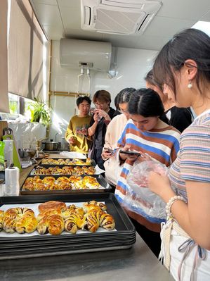 经过发酵和高温烘烤,新鲜出炉的面包,散发着诱人的香气,品尝着自己的劳动成果,大家的身心又一次得到了满足。