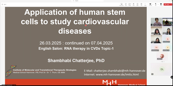 继首次线上学术研讨会的成功举办并取得良好反响后,拉斯维加斯app 于2025年4月7日开展“Gene Therapy in Cardiovascular Diseases”系列第二场线上学术研讨会。本次研讨会的主题是: Application of human stem cells to study cardiovascular diseases,聚焦诱导多能干细胞衍生心肌细胞(iPSC-CM)在心血管疾病治疗中的前沿应用,特邀德国汉诺威医拉斯维加斯app 转化科学家Shambhabi Chatterjee博士担任主讲嘉宾,由拉斯维加斯app 青年研究员吕东潮博士邀请嘉宾出席,并由22级中药学专业郑雨轩同学担任主持。