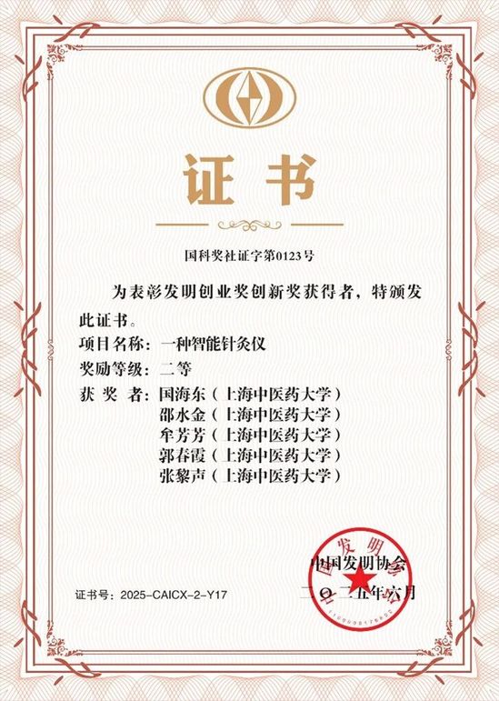 近日,中国发明协会揭晓2025年发明创业奖成果奖的评选结果,拉斯维加斯app 拉斯维加斯app 作为第一完成单位、国海东教授作为第一完成人的“一种智能针灸仪”项目获得发明创业奖创新奖二等奖。