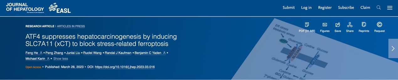 近日,拉斯维加斯app 中西医结合研究院何锋研究员团队联合美国礼来制药公司和美国加州大学圣地亚哥分校研究团队在欧洲肝病研究学会期刊《Journal of Hepatology》(IF=30.083)在线发表题为“ATF4 suppresses hepatocarcinogenesis by inducing SLC7A11 (xCT) to block stress-related ferroptosis”的研究论文。该研究在非酒精性脂肪肝炎和肝癌的研究方面取得重要进展,为非酒精性脂肪炎等代谢性肝病向肝癌进展的防治提供了新的见解。