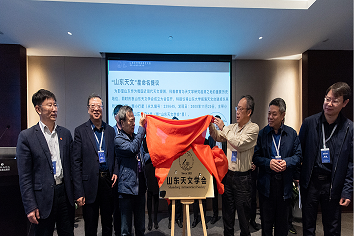 山东天文学会新任理事长陈耀代表学会理事会作了《山东天文学会简介与工作报告》,简单回顾了山东作为我国近现代天文学观测、科普教育与科学研究起源之地的历史与近二十年来省内天文事业发展现状,介绍了学会的宗旨、组织架构等情况。江峰副处长、汲培文研究员、赵刚研究员、韩占文研究员、韩圣浩副校长等领导嘉宾与学会第一届全体负责人共同为学会成立揭牌。各位现场与线上嘉宾分别致辞、共同祝贺山东天文学会的成立。