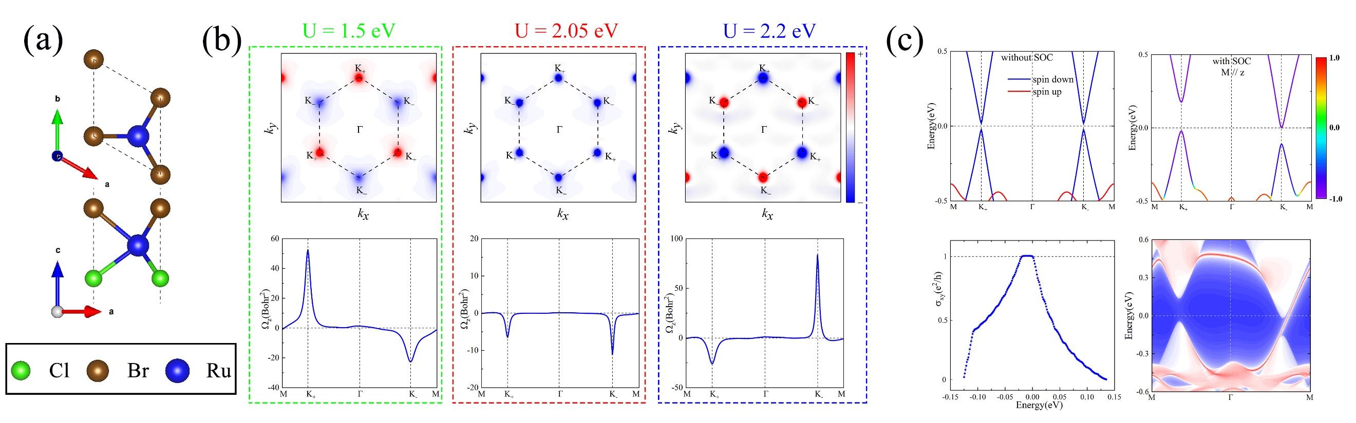 课题组基于密度泛函理论和紧束缚模型方法,成功设计了一种新型H相单层结构RuClBr。通过计算Berry曲率、陈数、反常霍尔电导以及在自旋轨道耦合作用下的手性边缘态,我们证明了具有高居里温度的单层RuClBr同时具有自发能谷极化现象和本征量子反常霍尔相,即量子反常谷霍尔效应相。特别重要的是,随着电子关联强度的改变,该体系可以在不同的量子态之间切换,包括铁谷态、半谷半导体和量子反常谷霍尔态。进一步的声子谱研究表明,单层RuClBr具有良好的动力学稳定性,易于在实验中制备。新型二维材料RuClBr不仅丰富了当前的量子反常霍尔材料体系,揭示了电子关联效应在二维材料中谷相关物理特性,而且为基于谷特性的多功能量子器件设计提供了一个新型平台。