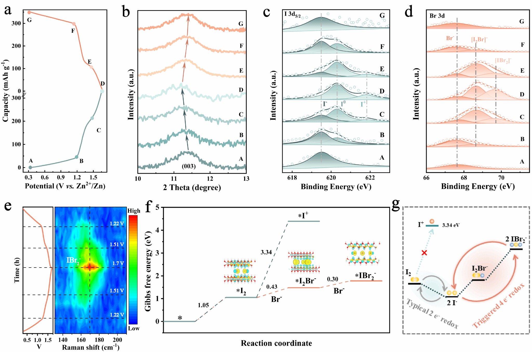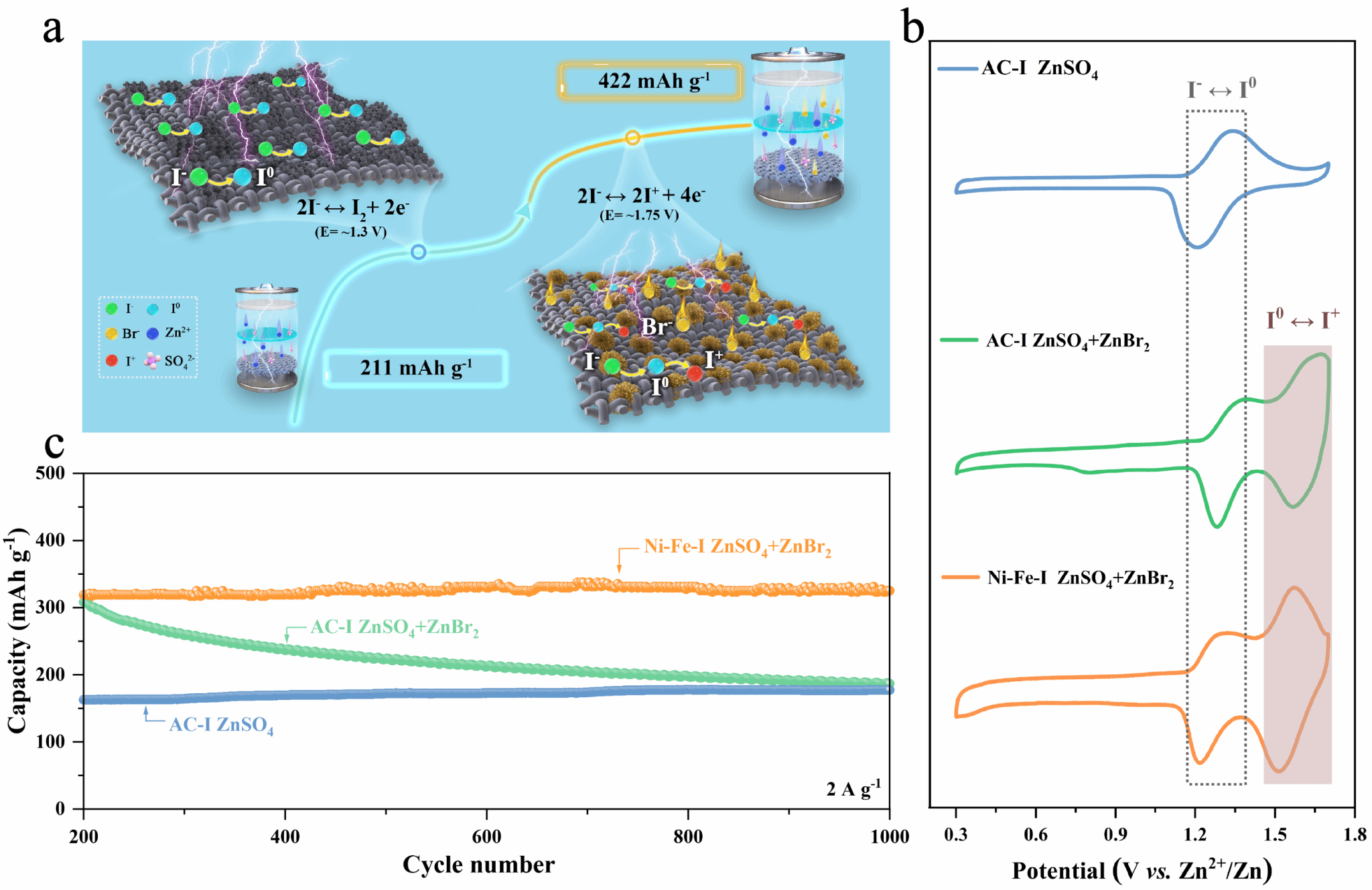 新兴的水系锌离子电池受到高度关注,具有转化机理的碘基正极材料具有丰富的资源、氧化还原价态和高容量、高氧化还原电位等优点。如今,碘基阴极的反应通常发生在I-和I0之间的双电子氧化还原中,从理论上讲,碘物种可以进一步氧化到更高的I+价态。此外,由于碘物种的穿梭效应,基于碘基的氧化还原阴极通常具有较差的循环寿命和容量衰减。本文通过在电解液中引入Br-作为活化剂激发I0/I+四电子氧化还原反应,并以大层间距的Ni-Fe LDH作为宿主,限制I0/I+反应在其层内发生。极大地提高了容量并有效抑制了碘物种穿梭,实现了高容量和长循环稳定性的锌-碘电池。通过非原位XPS、原位拉曼表征技术和密度函数理论(DFT)计算发现,Br-作为碘物种的活化剂和稳定对存在,与碘作用生成卤素间化合物[IBr2]-来稳定I+的存在。Ni-Fe LDH被合成并用作碘的宿主,由于其层间距离大而稳定可以确保I-/I+氧化还原反应在层间发生从而有效抑制碘化物的穿梭效应。