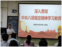 徐锡金首先详细解读了中央八项规定精神学习的重要意义,然后围绕中央八项规定的具体内容、精神实质、违反八项规定的具体表现以及相关案例等内容展开讲述,要求支部党员要将学习成果转化为实际行动,严格遵守中央八项规定精神,以身作则,发挥党员的先锋模范作用。