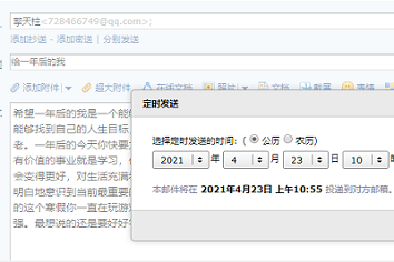 的全体同学在心理发展服务中心负责人的组织以及各班心灵使者的宣传下,通过QQ邮箱定时发送的方式为一年后的自己发一封定时邮件。信件内容可以是对未来的展望,或对一年后自己的挑战,或对一年后的自己讲述自己现在的故事。在保护隐私的前提下,由心理发展服务中心的活动负责人选出情感最丰富的几封信,在微信平台匿名展示。但不管什么内容的信件,在这精彩却又短暂的校园时光中,必然会成为一种情怀,一份深深的留恋。